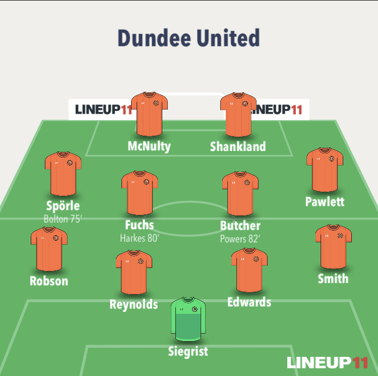 Every time we got the ball we looked to get it up to the attackers with immediate effect and our first real chance came when Hylton stung the palms of Benjamin Siegrist. In the first half, United didn’t really create much of their own accord despite also being direct. It took an error from Leo Hjelde to put them through on goal, Laidlaw again brilliantly denying Shankland. For the rest of the half it continued to be end to end constantly without much being created, apart from a few chances for Tony Andreu. This is due to really solid defending from both sides, the only real weakness coming for the Staggies- when Tremarco would push forward Leo Hjelde would be dragged too far out wide, leaving Callum Morris isolated in the middle.
