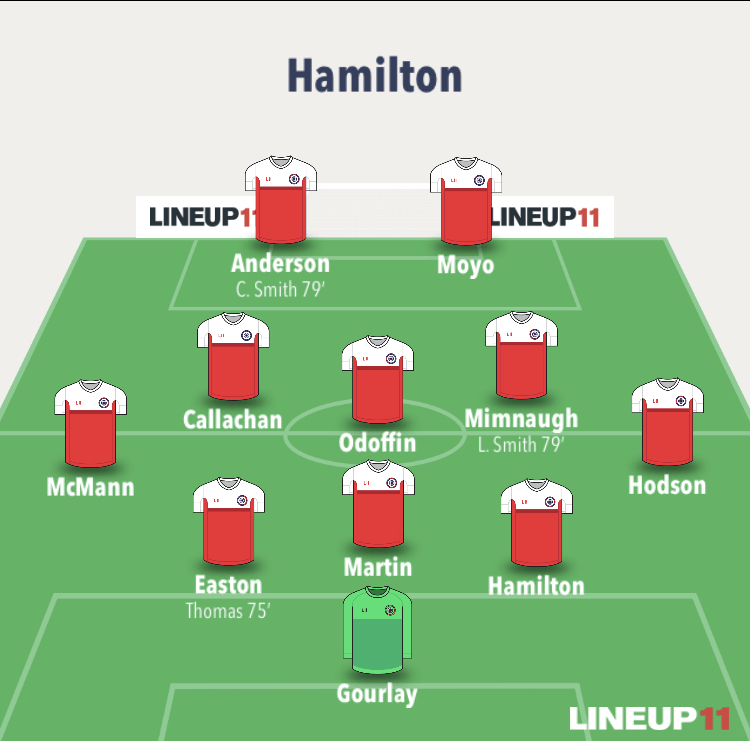 Hamilton had the better of the first 10 minutes, and County struggled to escape their own half. This wasn’t helped by Jordan White having to drop deeper to challenge for long balls due to the wind blowing against Laidlaw’s goal kicks. The Staggies’ link up play on the ground wasn’t quite clicking either, and it was apparent that they would have to grind it out to get the three points.